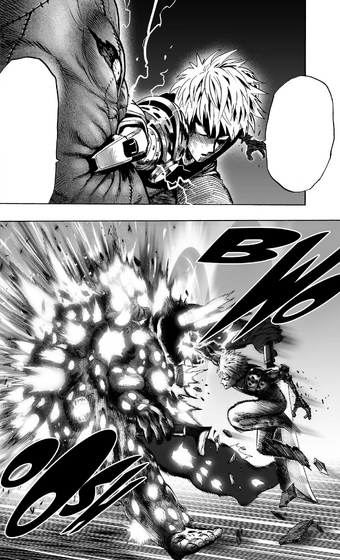 He had black sclera and a sinister smile. Genos blocks the monsters blades with his arms although the power of face rippers swings are strong enough to damage the cyborgs arms. With one punch he destroys a massive meteor headed for earth but no one believes he could be so extraordinarily strong.